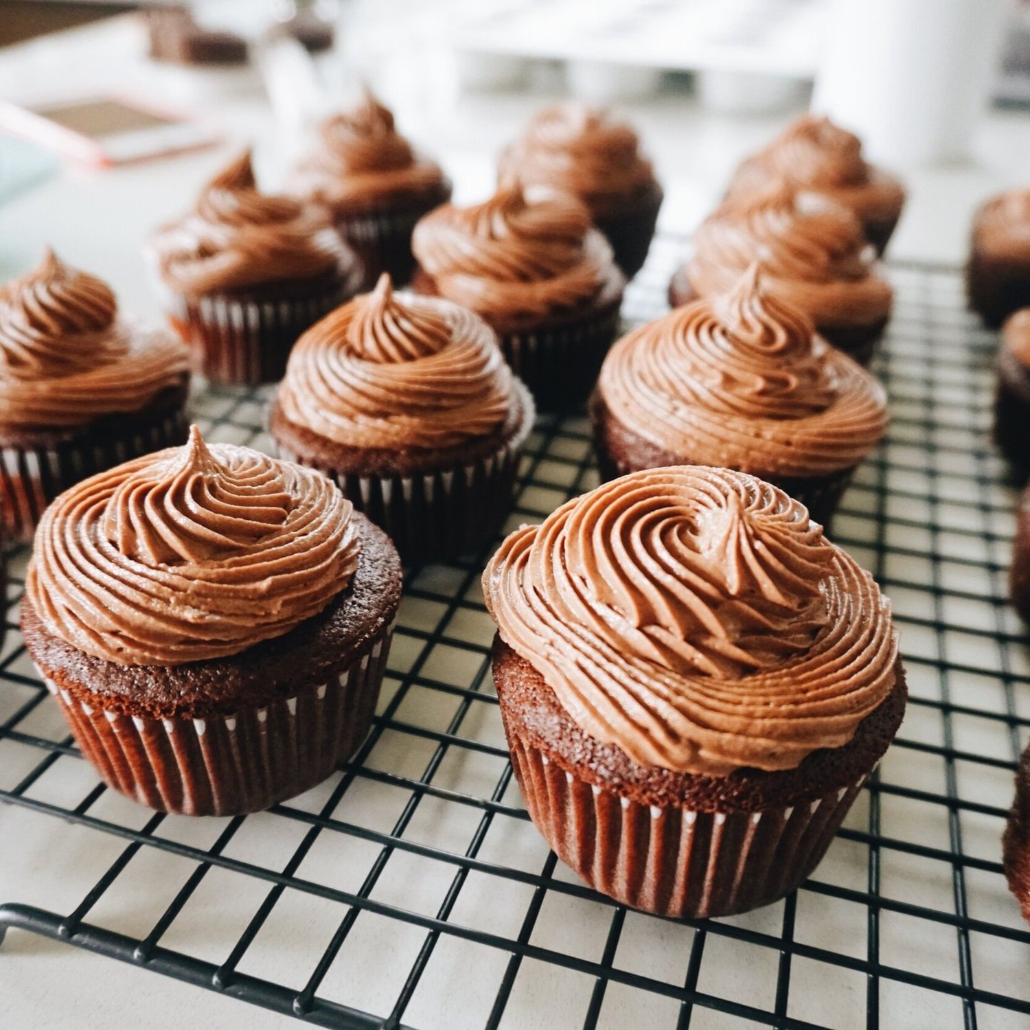 Taste it/eat a few spoonfuls to make sure it is perfect then put into a piping bag/ziplock with the tip cut out. You can also just spread on the tops of each cupcake with a knife