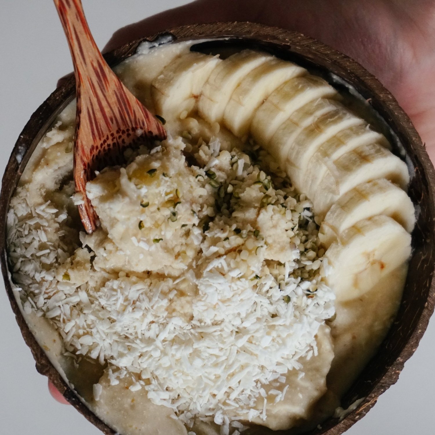 - Place in a bowl (my favorite are the coconut bowls) and top with your favorite toppings. Mine are listed in the ingredients above!