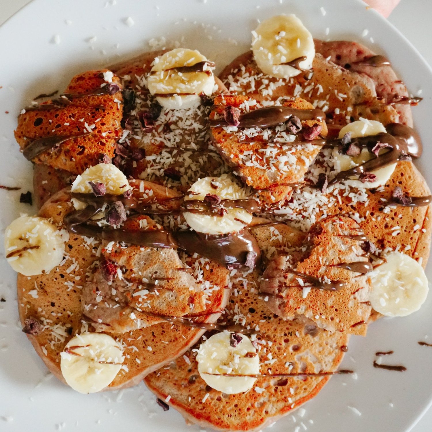 Once you have used all of your batter you can get creative with your topping & presentation! After all these are PINK PANCAKES!! I like to cut some out using heart cookie cutters to add some extra cuteness! I love adding sliced bananas, a drizzle of almond butter, coconut, & cacao nibs! Feel free to do what you like!