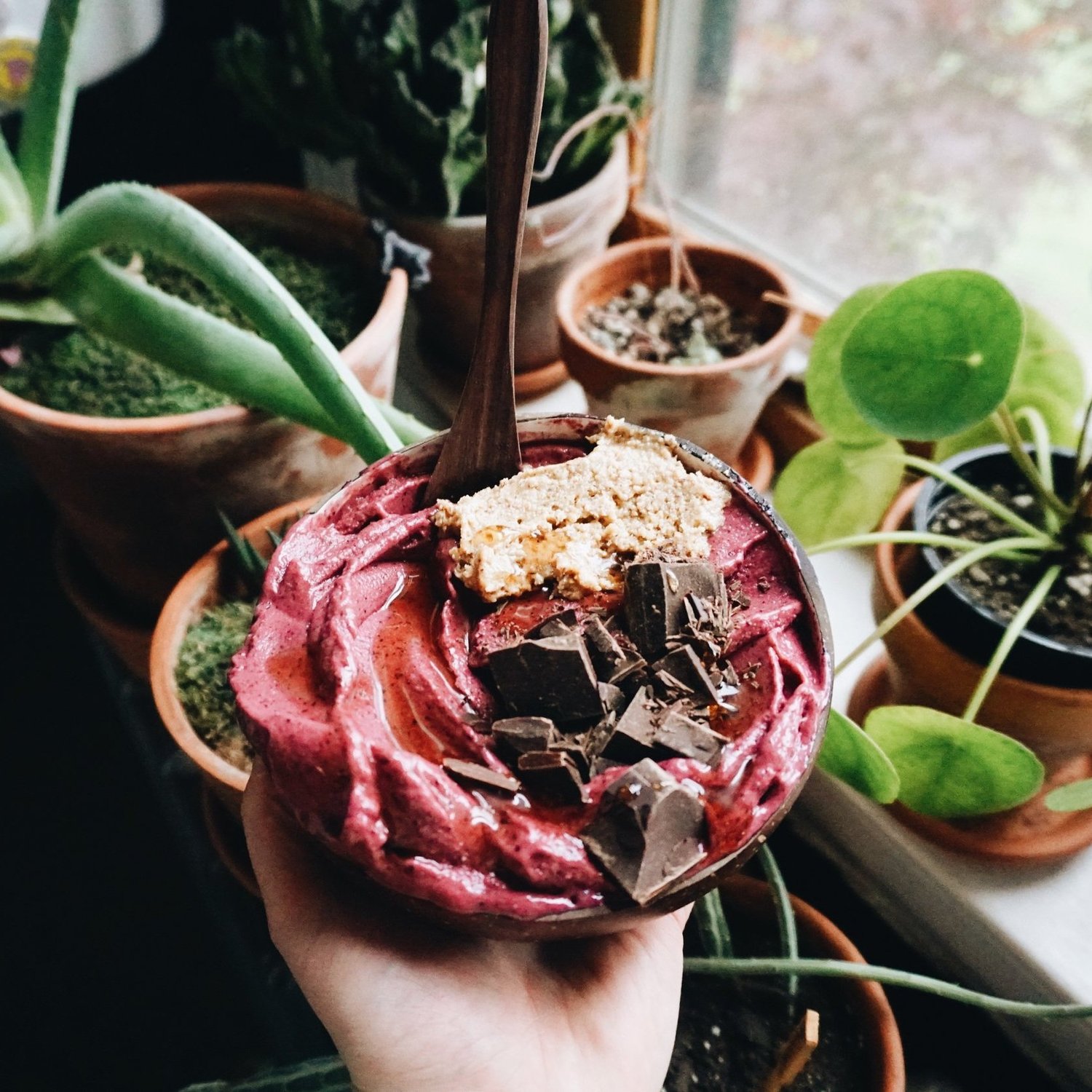 Pour out of blender with a spatula into a bowl and top with your favorite toppings! My personal favs are below