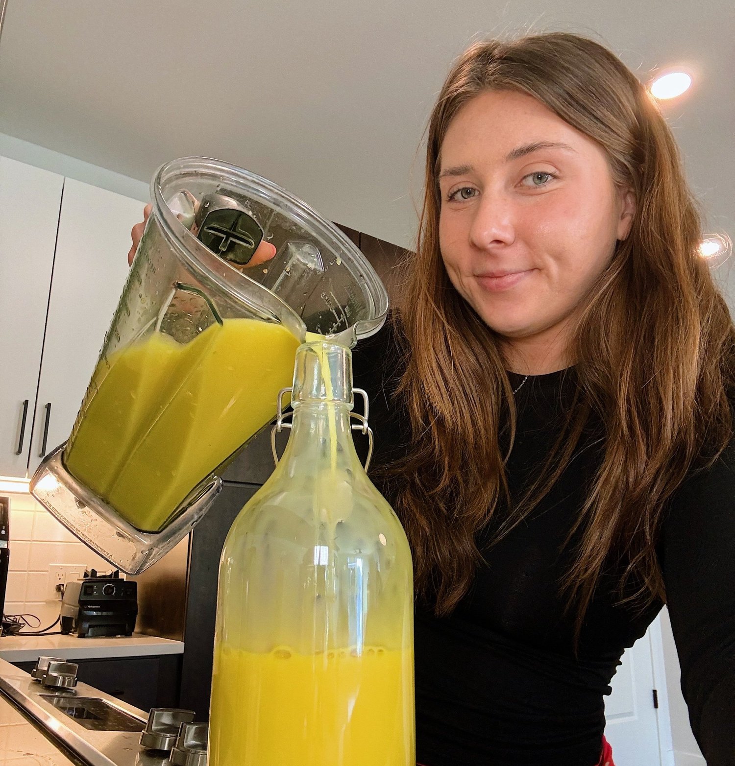 4. Slowly squeeze the bag, releasing the juice from the pulp. Be careful not too make too much of a mess because the turmeric stains!!!